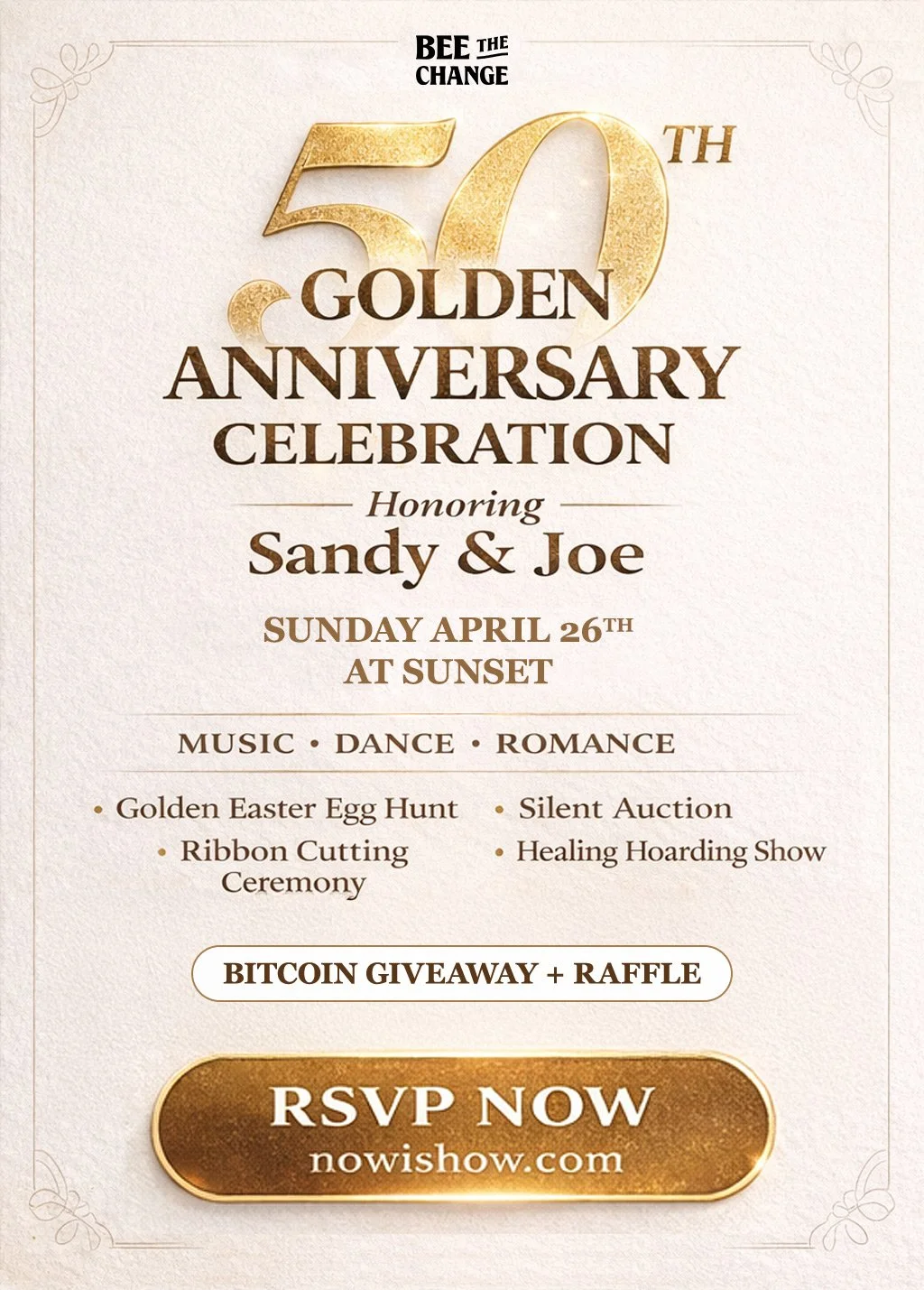 We’re gathering at sunset to celebrate 50 years of love with an evening that blends elegance, playfulness, and heartfelt moments. Expect a warm atmosphere, meaningful surprises, and a celebration designed to feel both intimate and unforgettable.