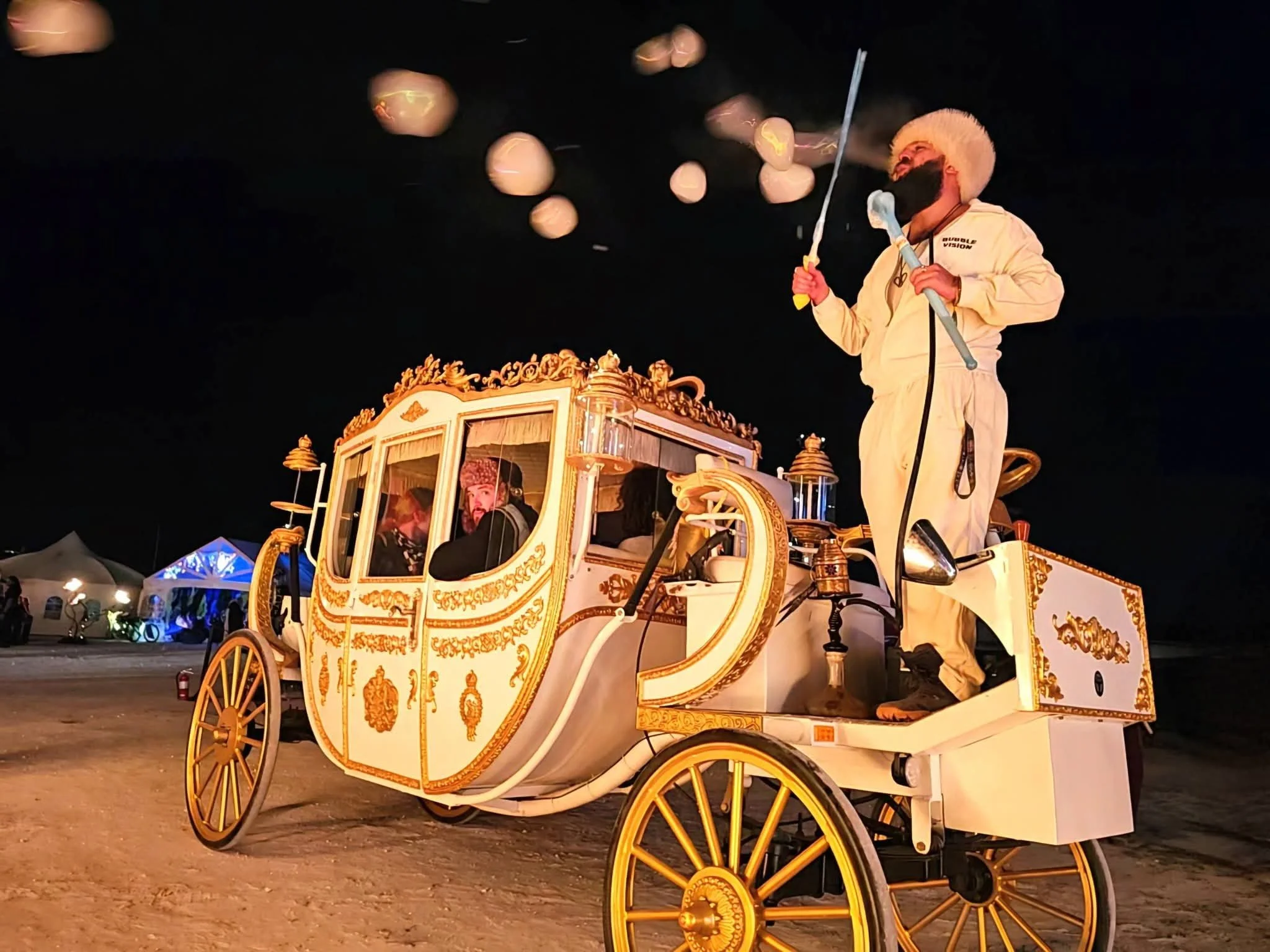 Our white and gold chariot is available for weddings, private events, festivals, shows, and cinematic moments. Equal parts sculpture and spectacle, it transforms any setting into something unforgettable.